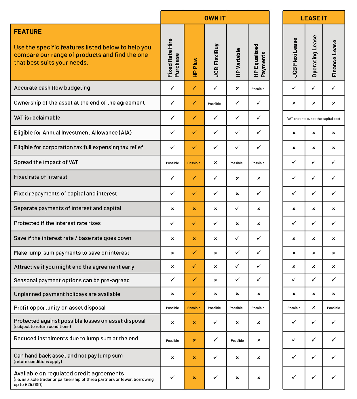 HP Plus is a fixed rate Hire Purchase (HP) product designed by JCB Finance to provide UK businesses with a way of spreading the cost of buying JCBs, plant, equipment and vehicles, through regular fixed instalment payments and have the flexibility to make ad-hoc lump sum payments and reduce the interest charged. Plus, this facility comes with a built-in payment holiday feature which enables you to take unplanned payment holidays without effecting your credit rating.