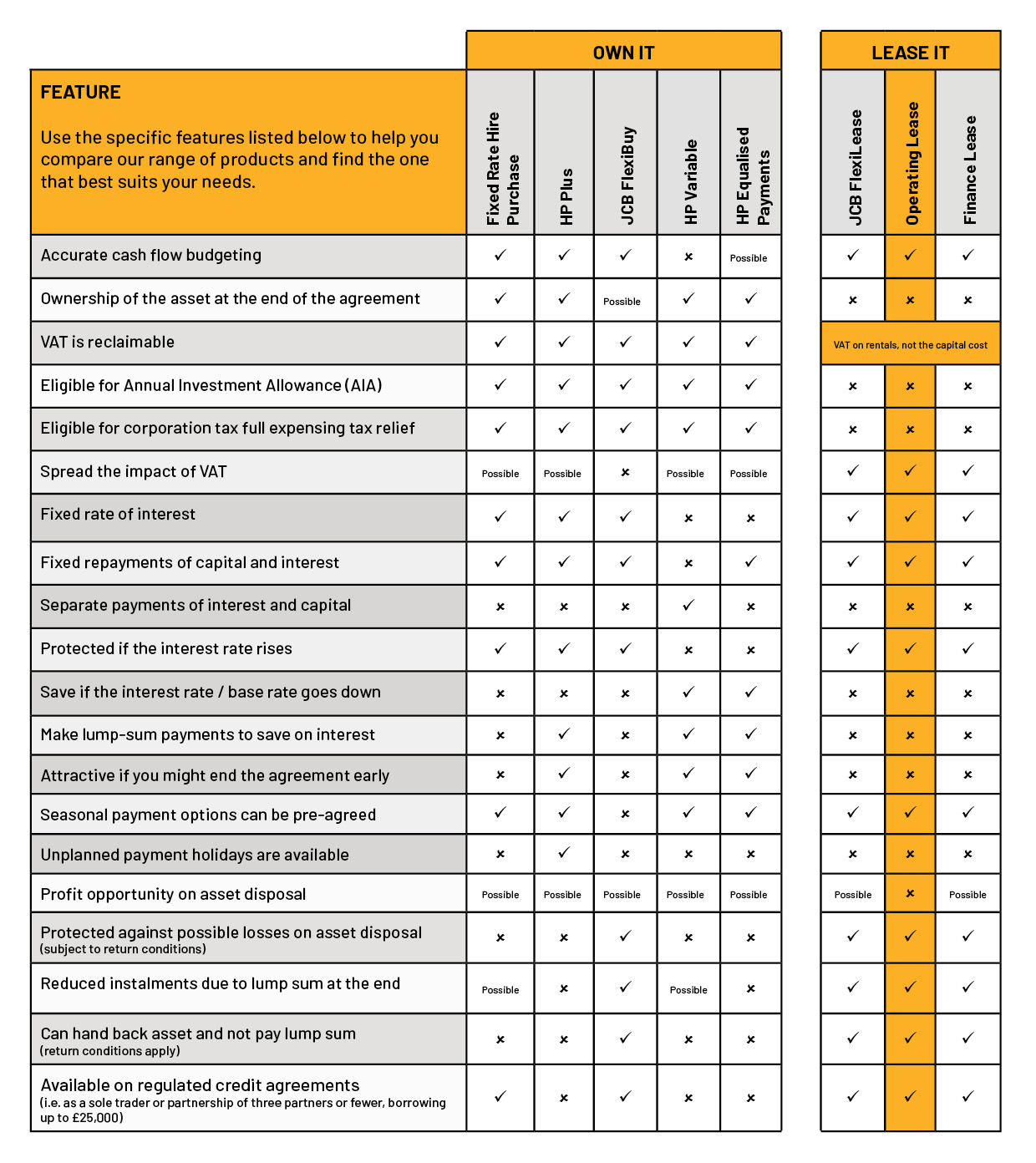 JCB Finance provide Operating Lease agreements regulated by the Consumer Credit Act (1974) to Sole Traders or Partnerships of 3 or fewer, where the total amount payable is under £25,000.