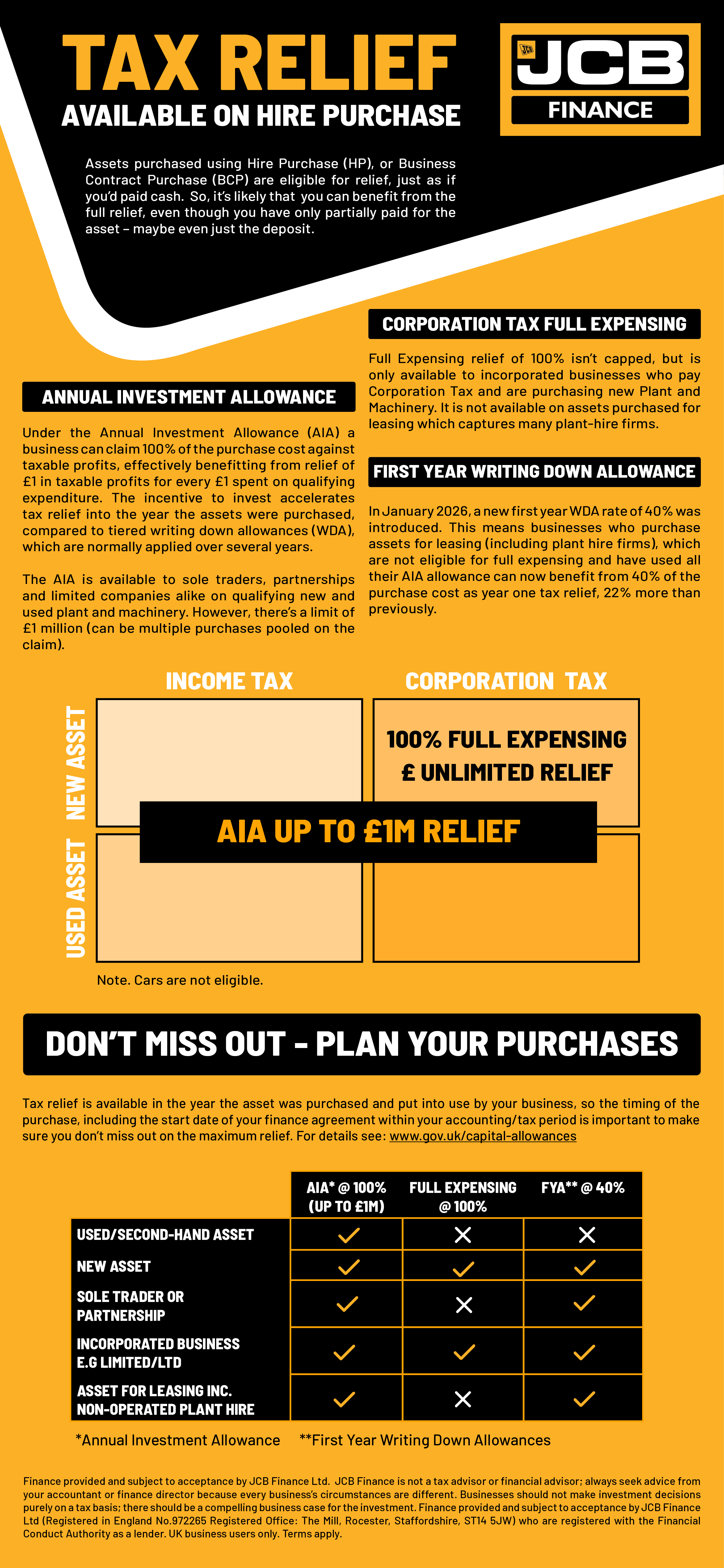 JCB Finance is not a tax advisor or financial advisor; always seek advice from your accountant or finance director because every business’s circumstances are different. Businesses should not make investment decisions purely on a tax basis; there should be a compelling business case for the investment. UK business users only; terms apply.